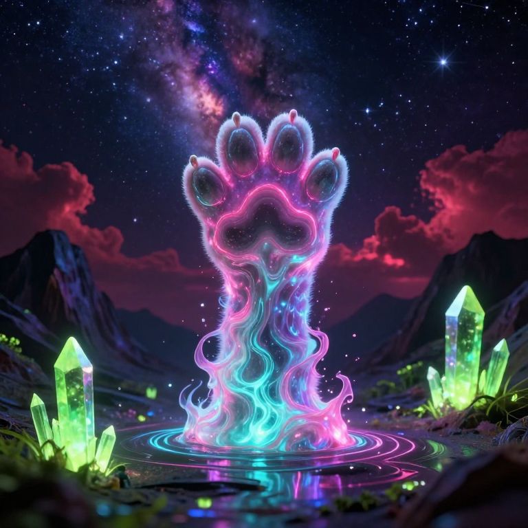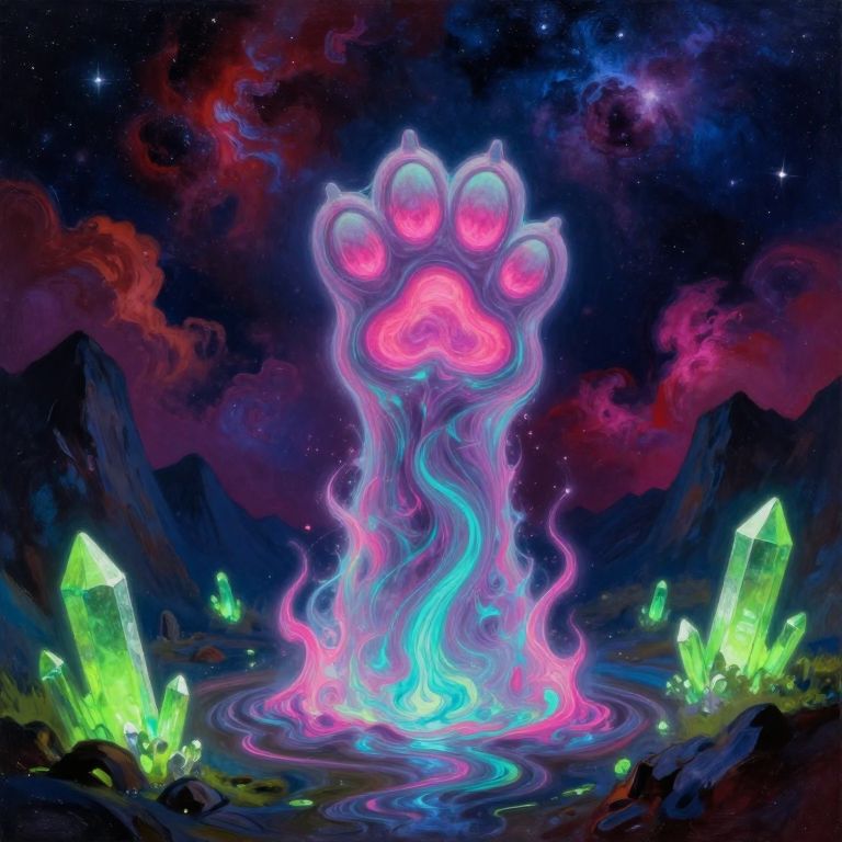This is a highly detailed and intricate digital painting, depicting a lone black cat standing in a vast, eerie landscape under a dark, starry sky, Blood red crescent moon, The cat with its furry black visage faces a towering, ancient, and crumbling monolithic stone structure with a glowing magenta cat pawprint rising to the heavens, The foreground is a grey, mossy plain with faint will-o-wisps illuminating the scene, a faint, eerie glow, creating a surreal, haunting atmosphere, The camera angle is low, emphasizing the height of the structure