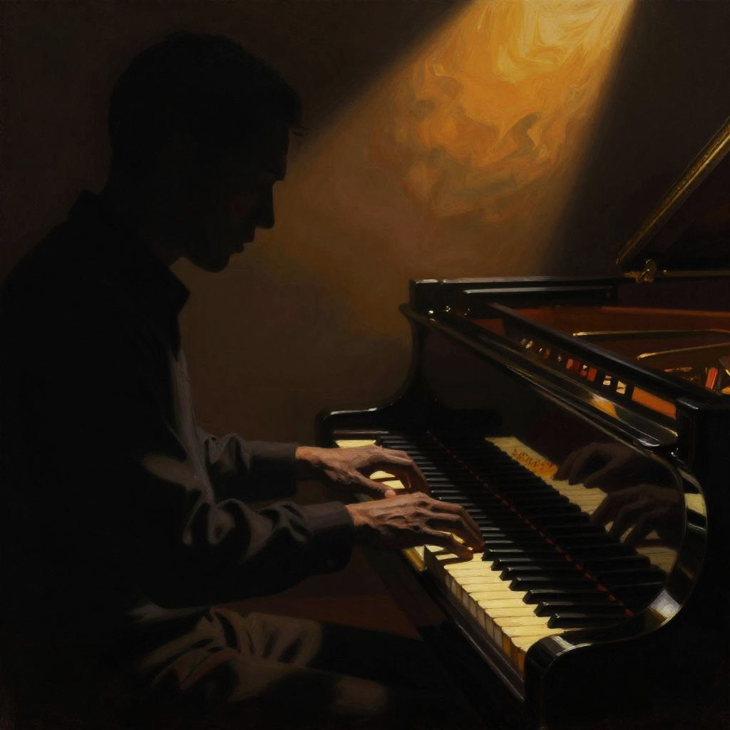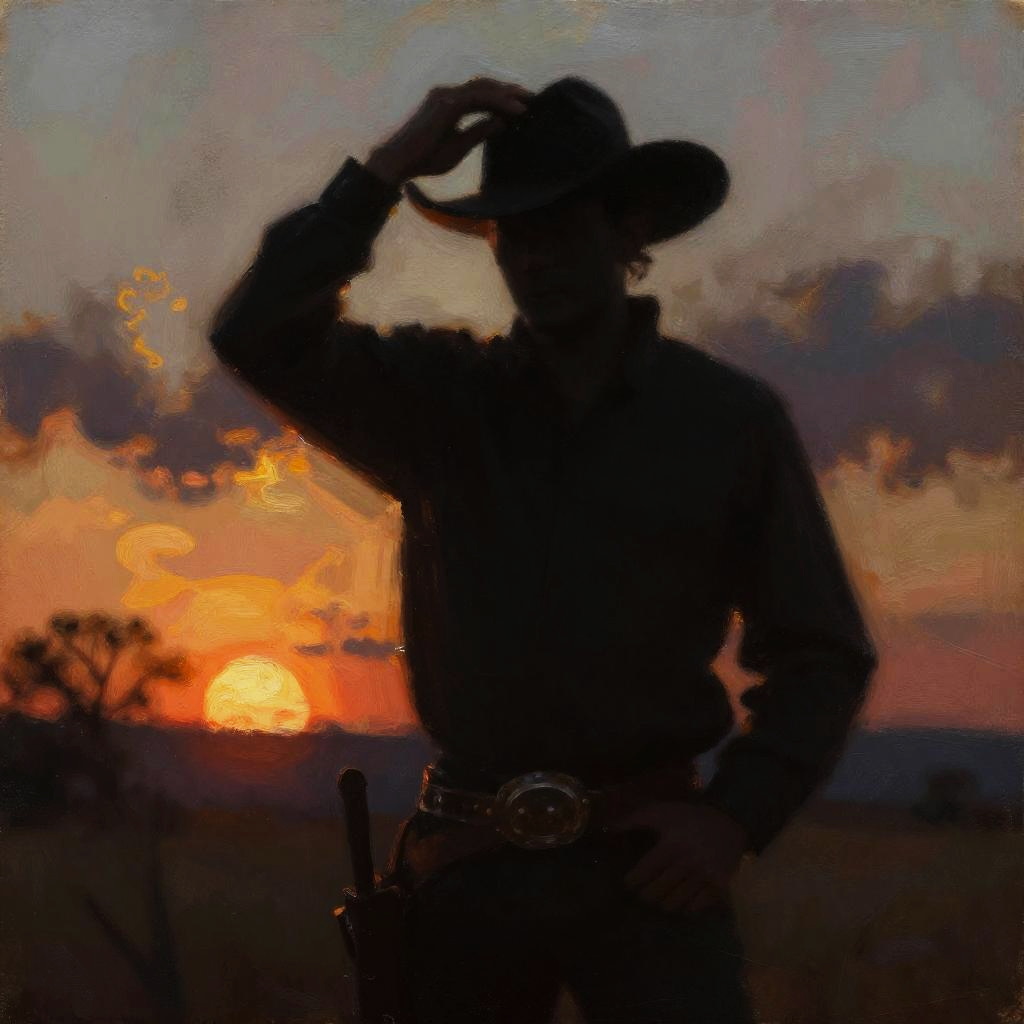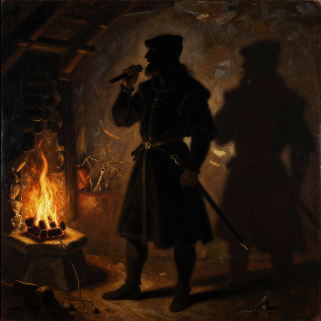 A silhouette of a medieval bard singing, with firelight casting dancing shadows behind him, styled in Renaissance oil painting, dark and atmospheric, hyper-detailed