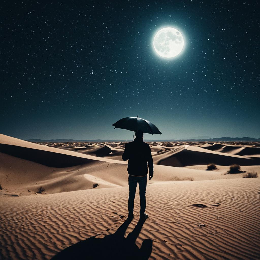 Drone shot of a figure in a moonlit desert dunes, holding an umbrella and looking at the sky with a smile, with the mystery card in hand, against a peaceful natural backdrop.