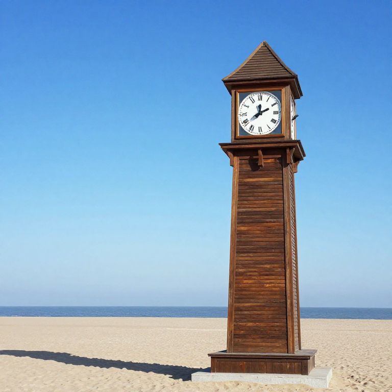 Time stands paradoxically still and eternal beneath the azure sky, as a wooden clock tower defies gravity on a sun-kissed beach, embodying the timeless dance between serenity and the relentless march of existence.