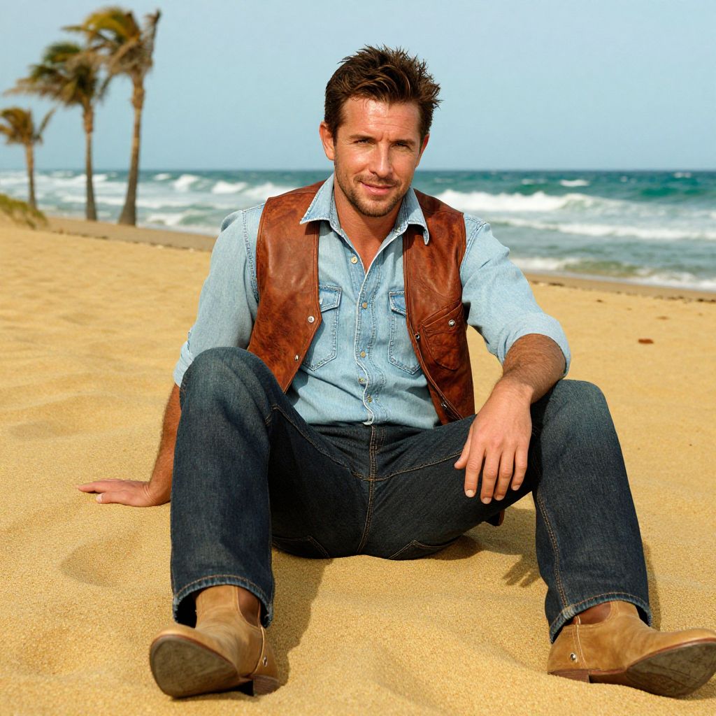 Photograph of a white man with short, dark brown hair and light stubble, sitting on a sandy beach. He wears a light blue, button-up shirt, dark blue jeans, and brown leather boots. A brown leather vest is over his shirt. He leans back with his left arm on the sand and his right hand resting on his knee. The ocean with white waves is in the background, and two palm trees sway to the left. The sky is clear and blue, adding contrast to the sandy beach. His expression is relaxed and slightly smiling.