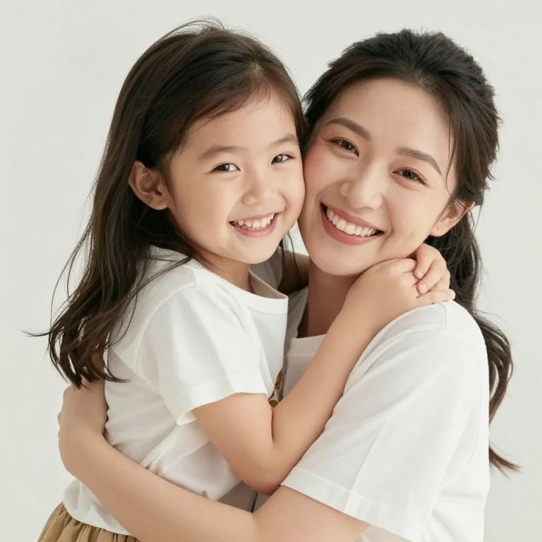 Joyful embrace between a young mother and her daughter, both smiling warmly as they hug closely together.