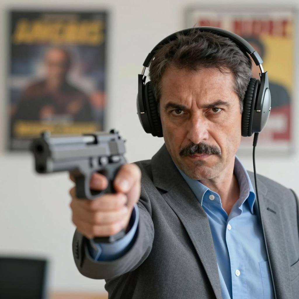 Two men with guns, aiming forward. The left man has dark hair, glasses, a mustache, and wears a brown leather jacket. The right man has dark hair, no mustache, and wears a black leather jacket with a red and yellow tie. Both have intense expressions. Background is dark with a tiled wall.