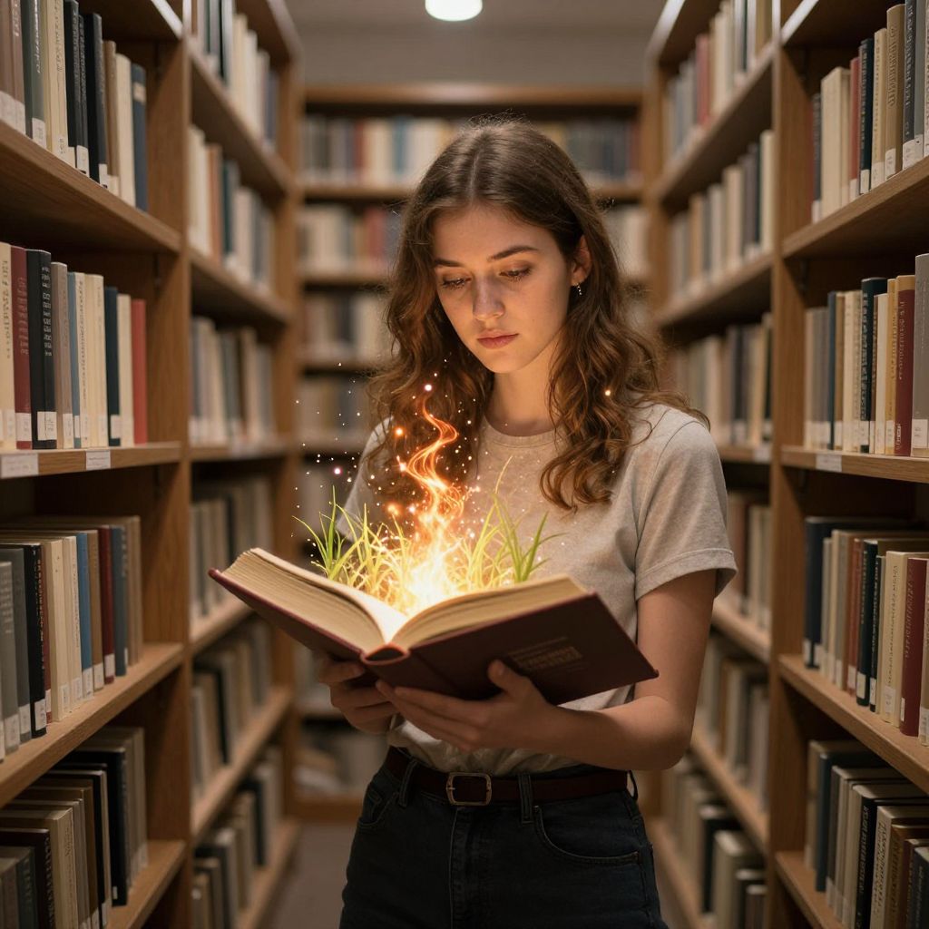 A young woman stands amidst endless bookshelves, holding an open tome whose pages are alive with glowing embers and sprouting grass, as if the book itself is a portal to a magical world where knowledge blooms and sparkles like stardust.