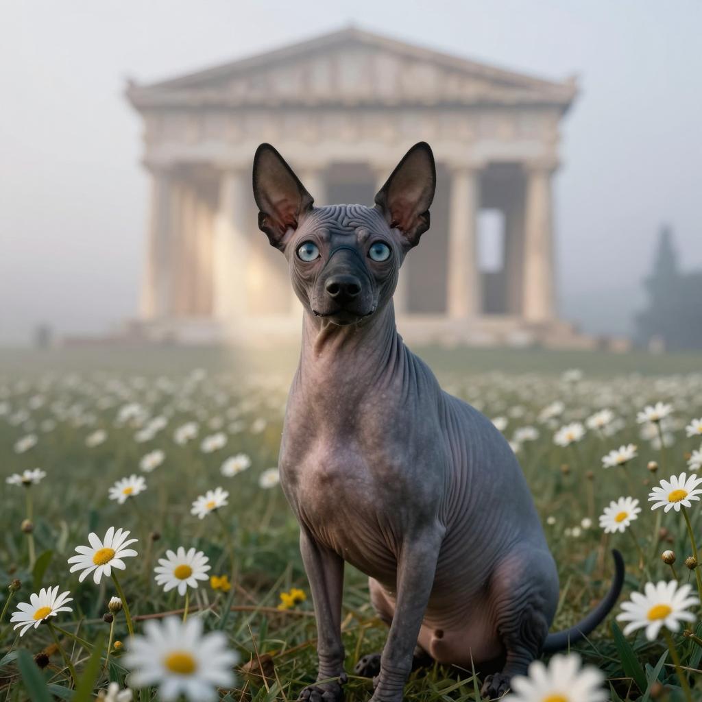 Hairless Dog Sitting in Daisy Meadow with Greek Temple