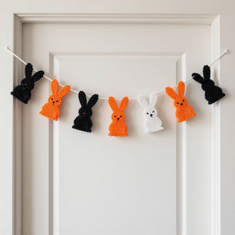A whimsical beaded banner of Easter bunnies, crafted with vibrant beads in orange, black, and white, defies gravity as it floats serenely against a plain door, transforming an ordinary wall into a playful, imaginative scene.