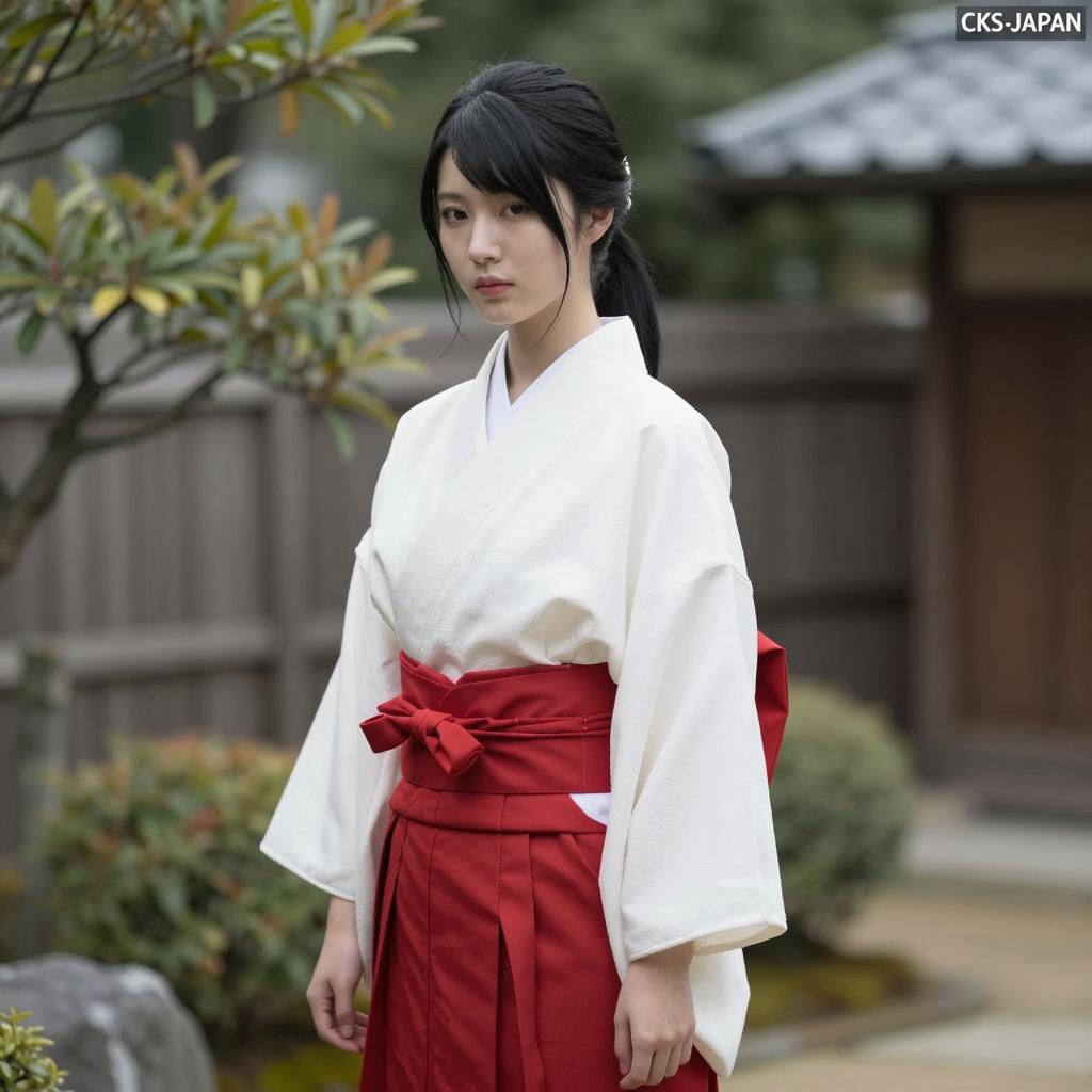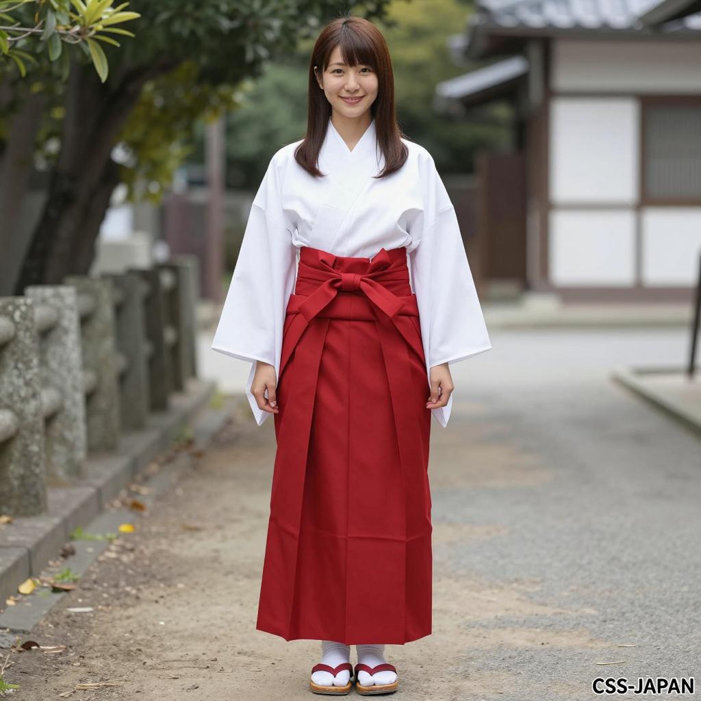 Photograph of a Japanese woman with straight brown hair in a white kimono top and bright red hakama with a wide sash, standing outdoors on a dirt path. She holds the hem of her hakama with both hands, smiling. She wears white socks and wooden sandals. Background includes green trees, a stone fence, and a white building. "CSS-JAPAN" is on the right side.