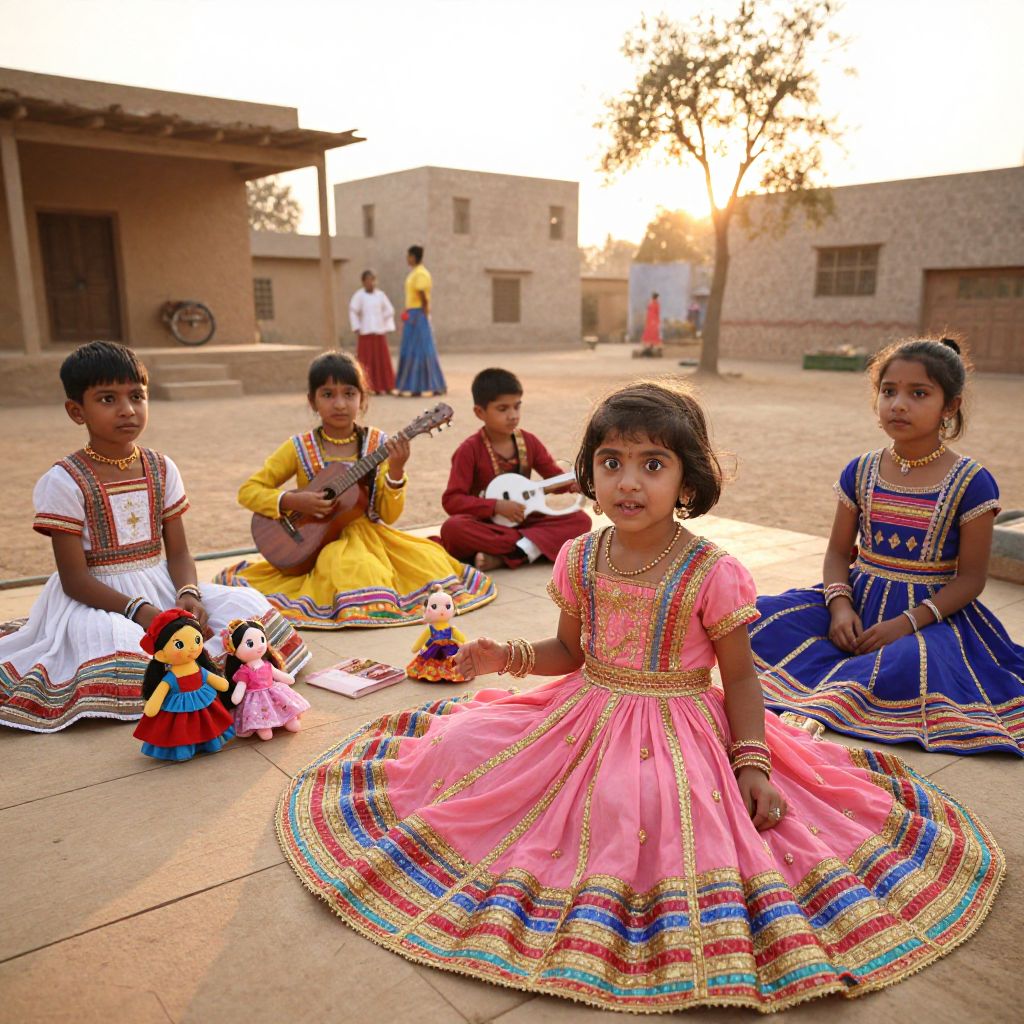 Children playing in a rural village during a celebration, dressed in handmade lehenga costumes with colorful borders and traditional patterns; one girl has a pink lehenga with gold zari, her eyes wide and curious, sitting on a wooden floor with dolls and traditional music playing in the background; golden hour lighting, soft earthy tones
