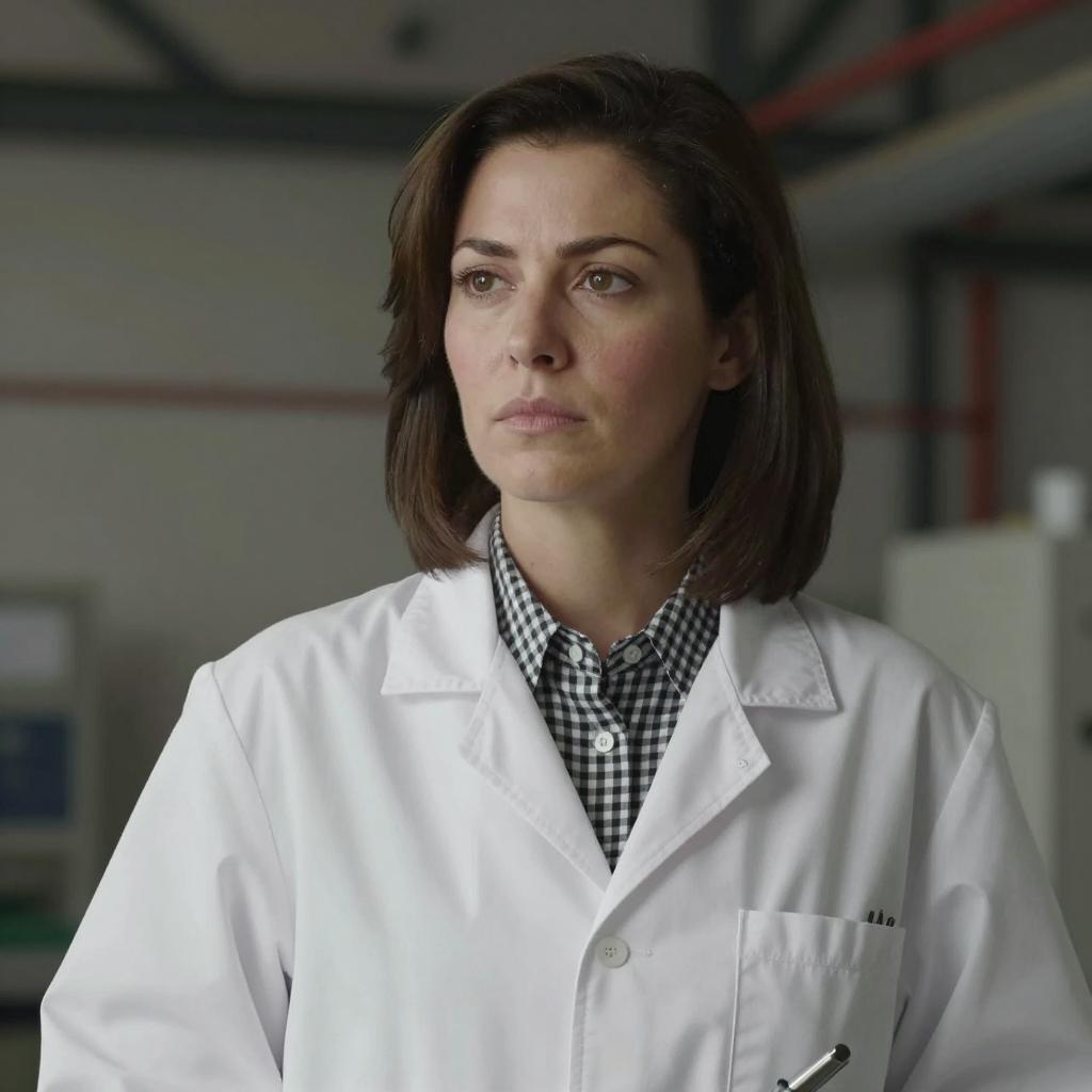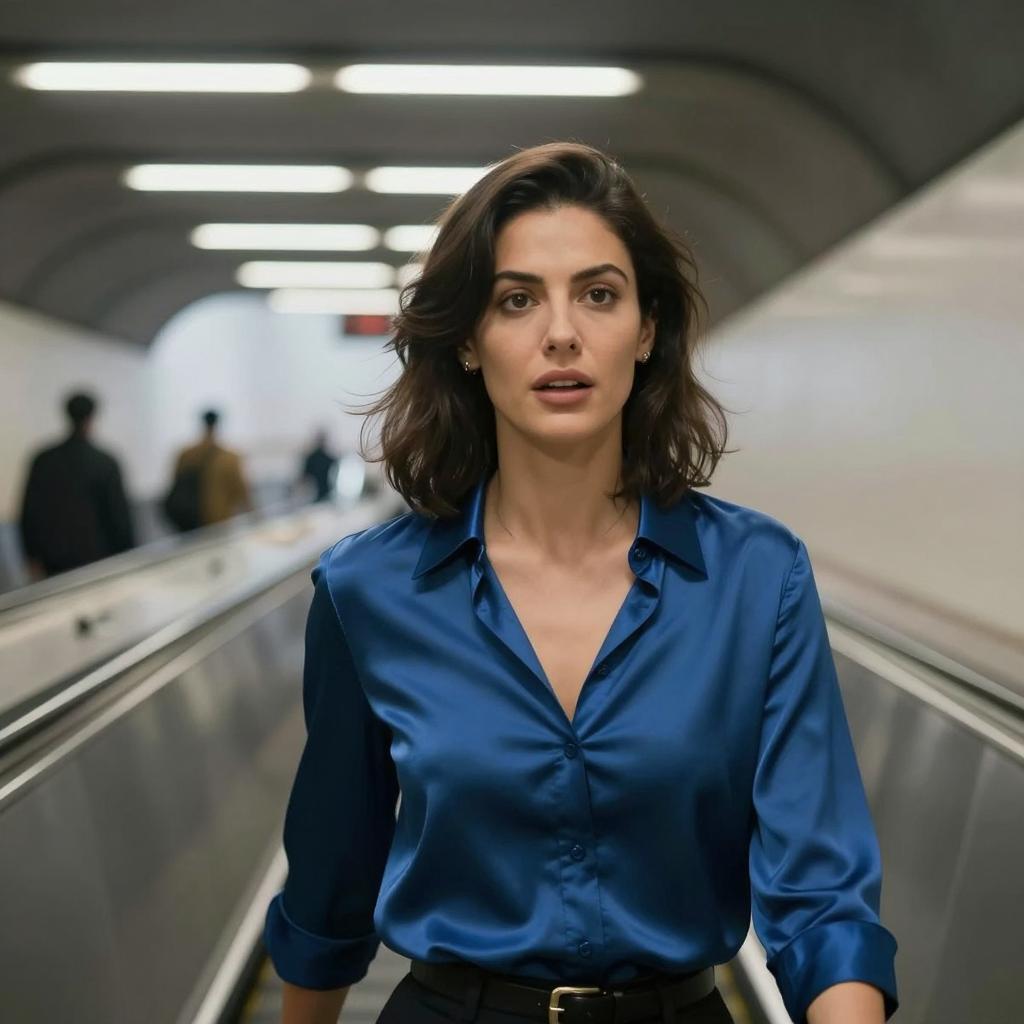 Photograph of a woman with medium-length dark brown hair, wearing a shiny blue satin blouse, walking down an underground subway escalator. She has a slightly surprised expression. Background includes overhead lights, curved walls, and other people in the distance.