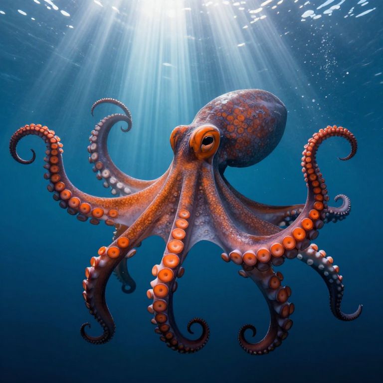 Enormous octopus gracefully extends its eight tentacles adorned with vibrant orange suction cups, weaving through the ethereal underwater realm illuminated by vertical light beams cascading from above.