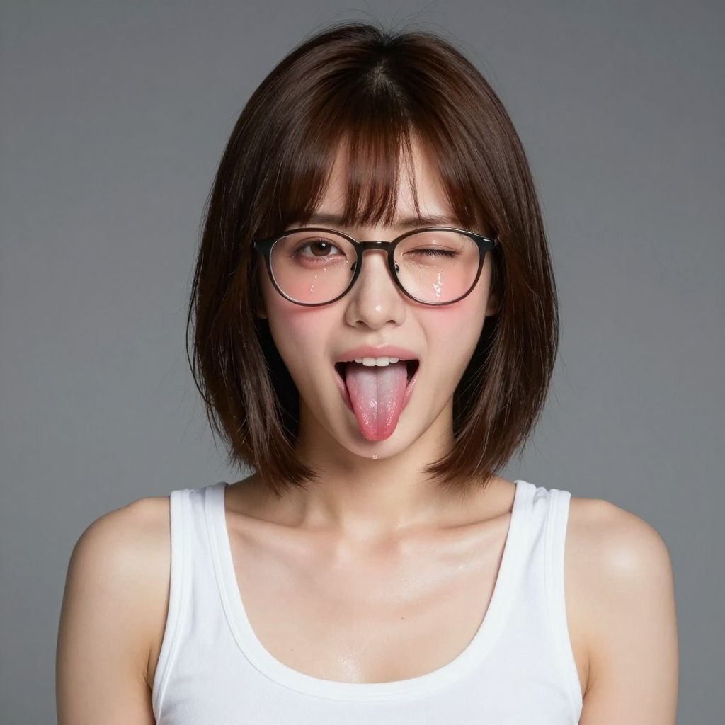 Photograph of an Asian woman with medium-length black hair and straight bangs, wearing large, round glasses and a white, ribbed tank top. She has fair skin and her tongue is playfully sticking out. The background is a plain, solid gray. Her expression is cheerful and she has a slight sheen of sweat on her face. The image is brightly lit, highlighting her features and the texture of her tank top. The focus is sharp, capturing her playful demeanor.