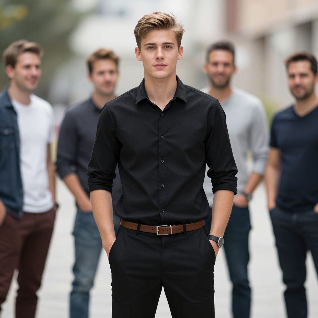 Photograph of a handsome, young white man with short, light brown hair, standing confidently in the center. He's wearing a black, button-up shirt with sleeves rolled to the elbows, black pants, and a brown belt. His hands are in his pockets. In the blurred background, four men in casual clothes stand, smiling and looking at him. The setting appears to be an outdoor urban area.