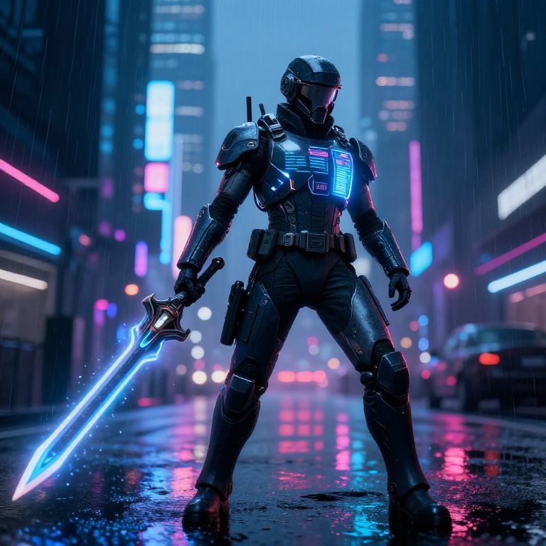 A digital CGI image depicts a futuristic, armored soldier standing in a neon-lit, rainy city street. The soldier, clad in dark, high-tech armor with glowing blue cybernetic patterns on the chest, wields a glowing blue sword in their right hand. The background features tall buildings with vibrant neon signs in pink, blue, and white, reflecting on the wet, glossy street. Raindrops are visible, adding a dynamic, textured effect. The soldier's stance is powerful and ready for action, with a helmet obscuring their face, creating a mysterious and intense atmosphere.