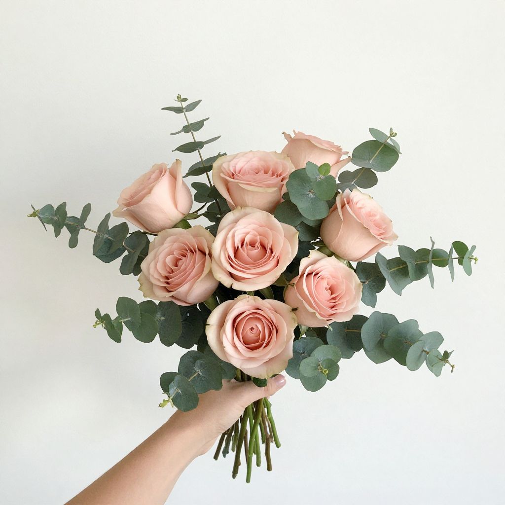 Hand holding a delicate bouquet featuring six blush-pink roses interspersed with lush green eucalyptus leaves, showcasing a minimalist yet elegant floral arrangement against a clean white background.
