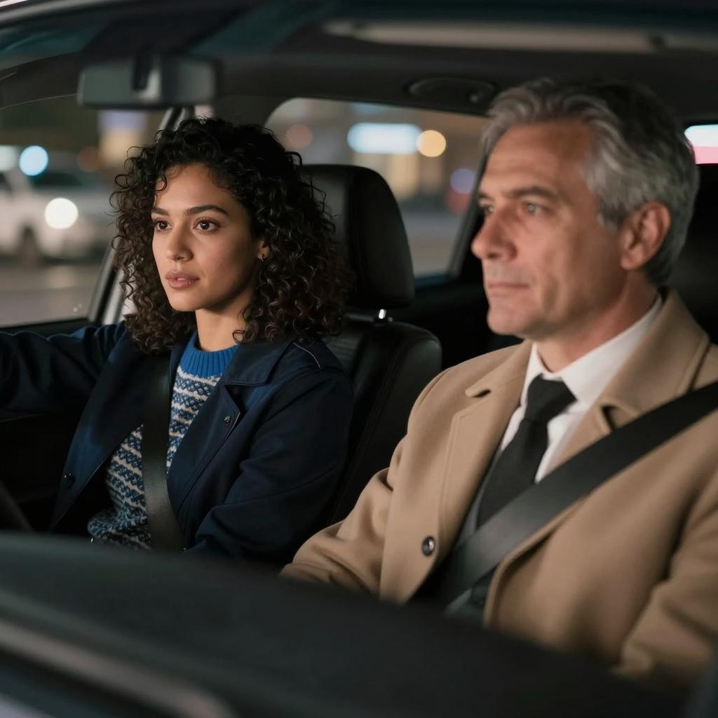 Woman with curly dark brown hair driving a car at night. She wears a white long-sleeve shirt, gold necklace, and brown leather gloves. Her right hand grips the steering wheel, head turned slightly to the right. Greenish interior light illuminates the car. Dark background outside.
