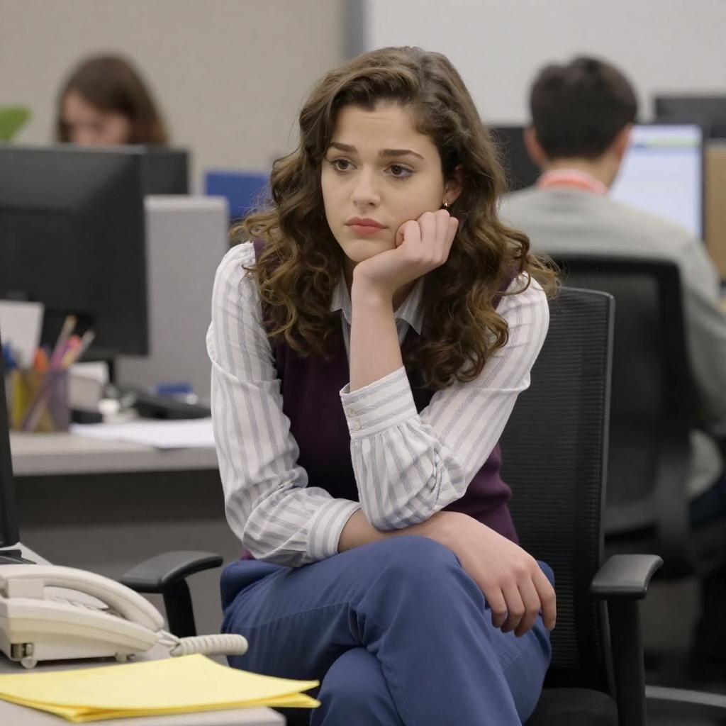 Young woman with wavy brown hair, wearing a striped shirt, dark purple vest, and blue pants, sitting on a desk. She rests her chin on her hand, looking thoughtful. Background includes blurred people and office supplies. White telephone and yellow paper in the foreground. Casual office setting.