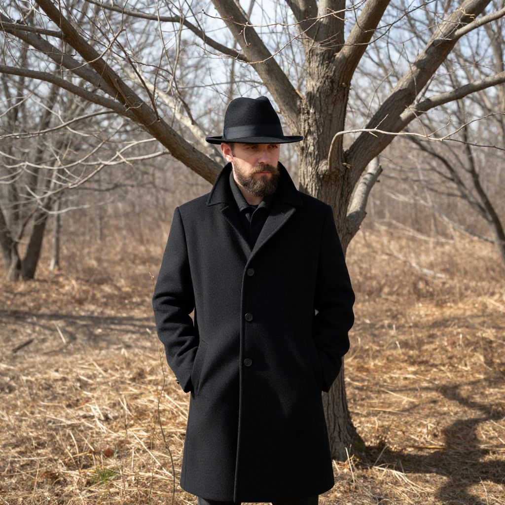 A man with a full beard and a well-groomed mustache stands in front of a bare tree with no leaves. He is wearing a dark, long black coat with a collar turned up, paired with a black fedora hat that slightly tilts to one side. The scene is set in a quiet, autumn-like forest clearing, with the sun casting long shadows and a subtle breeze rustling the dry, wind-blown branches of the tree. The atmosphere is calm and slightly mysterious, emphasizing the man's solitary presence against the desolate, leafless backdrop.
