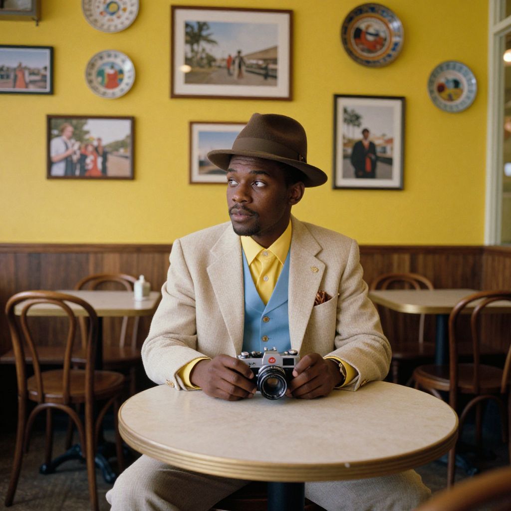 Photograph of a Black man with dark skin and a lean build, sitting at a round wooden table in a vintage-style café. He wears a beige checkered suit, yellow shirt, brown fedora, and holds a vintage camera in his lap. The café's yellow walls are adorned with framed pictures and colorful plates. Wooden chairs surround empty tables in the background. The man has a serious expression, and the lighting is bright, highlighting the retro atmosphere.