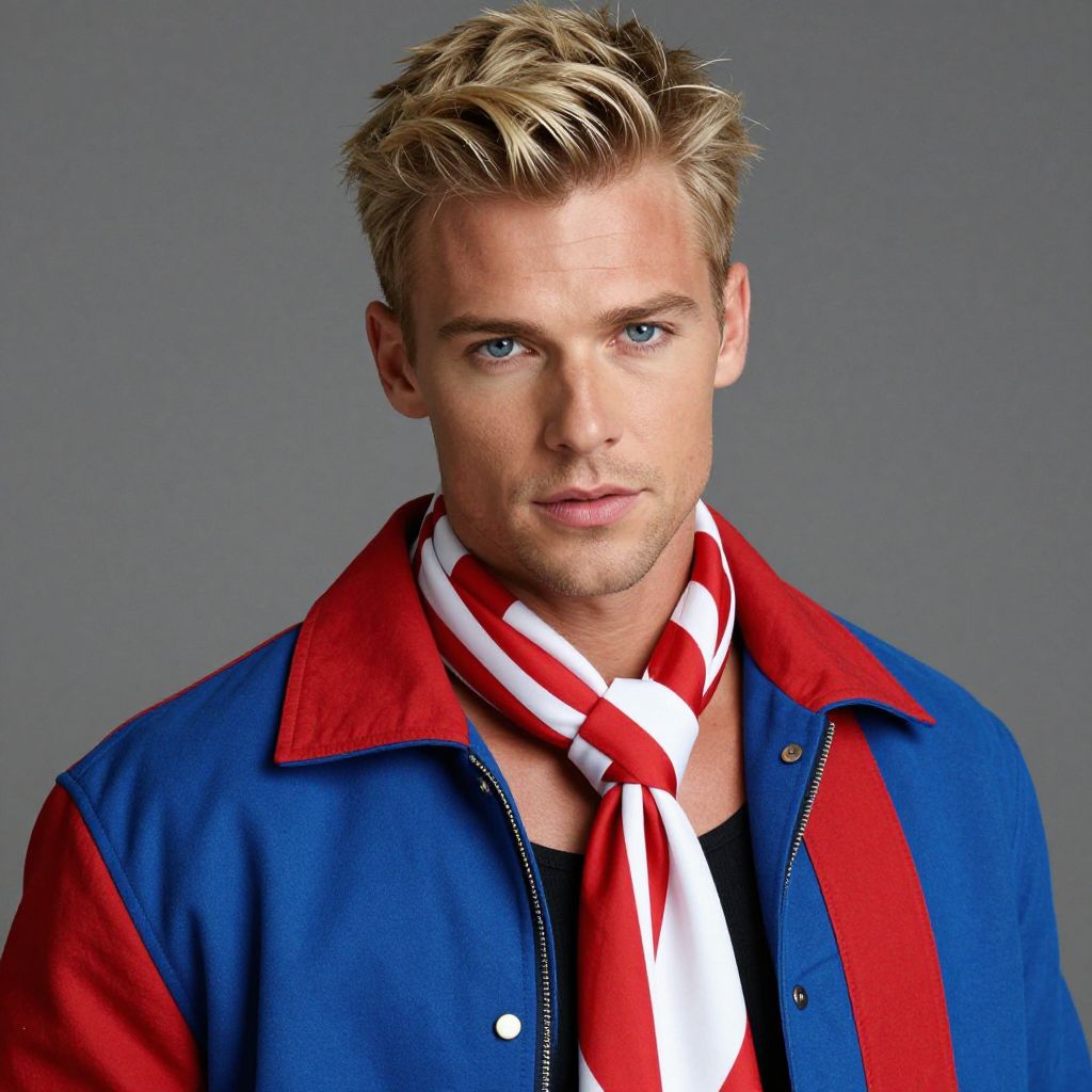 A handsome man with bright blonde hair and striking blue eyes, exuding a confident and charismatic vibe, is wearing a vibrant blue and red jacket complemented by a stylish red and white scarf draped around his neck.