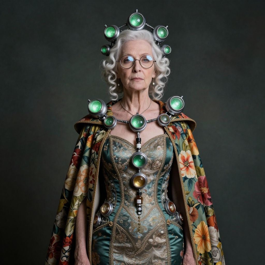 Photograph of an elderly woman with white curly hair, wearing a green, ornate corset, floral cape, and futuristic, glowing headpiece and