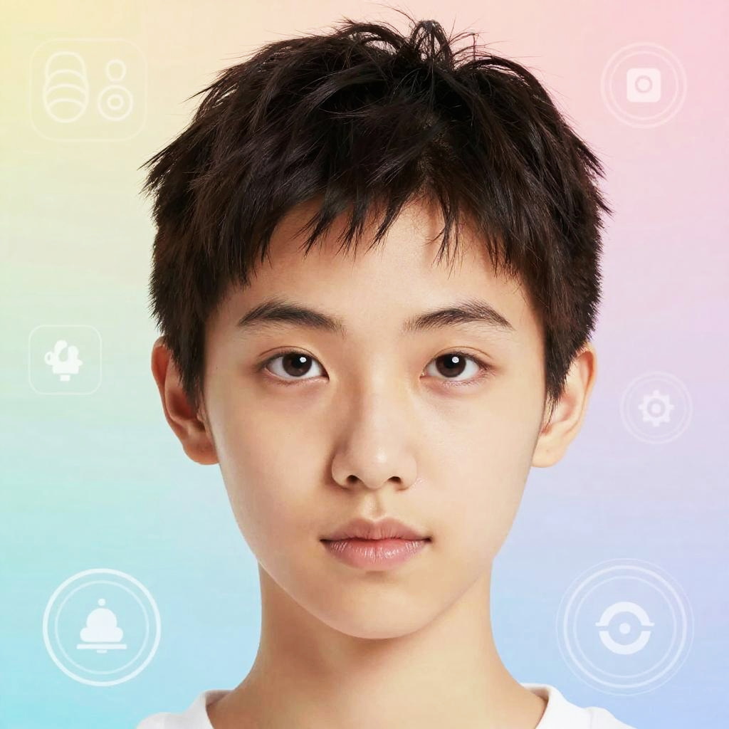 Short hair filter online, vibrant digital portrait of a young person with sleek short hair, augmented reality elements overlaying the face, bright and colorful background, modern technology aesthetic, high detail, soft lighting, futuristic interface icons