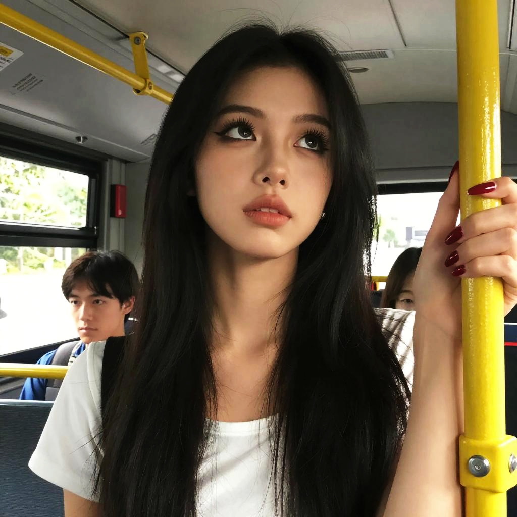 Photograph of a young woman with long black hair and heavy makeup, including dark eyeliner and mascara, looking up with a focused expression. She's holding an erect, circumcised penis with red-painted nails. The man's white shirt and the interior of a bus, with yellow handrails, are visible in the background. The lighting is bright, highlighting the woman's detailed features and the man's genitals.