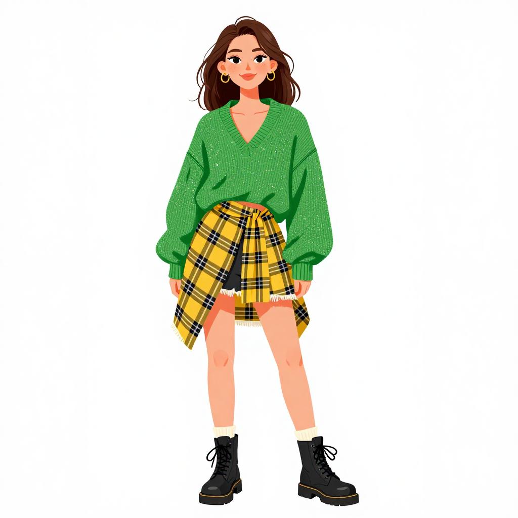 Woman with pretty face and pretty hair. smiling Woman, casual comfort, oversized chunky knit sweater dress in beige, turtleneck, long sleeves, ribbed texture, thigh-length, black tights with green floral pattern, black lace-up combat boots with a chunky sole, white studio background. --sref 1467