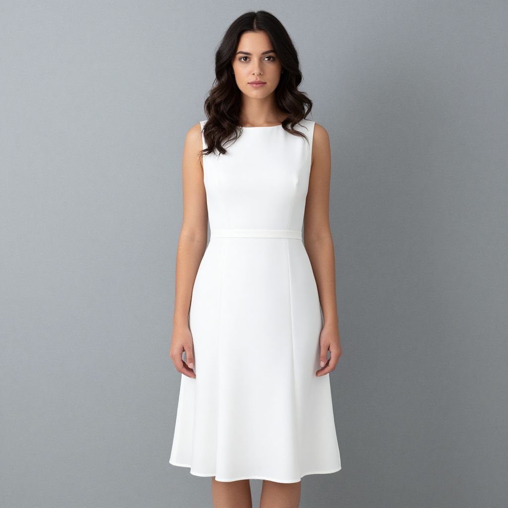"White Wilma Dress, a woman in a white dress standing in front of a wall"