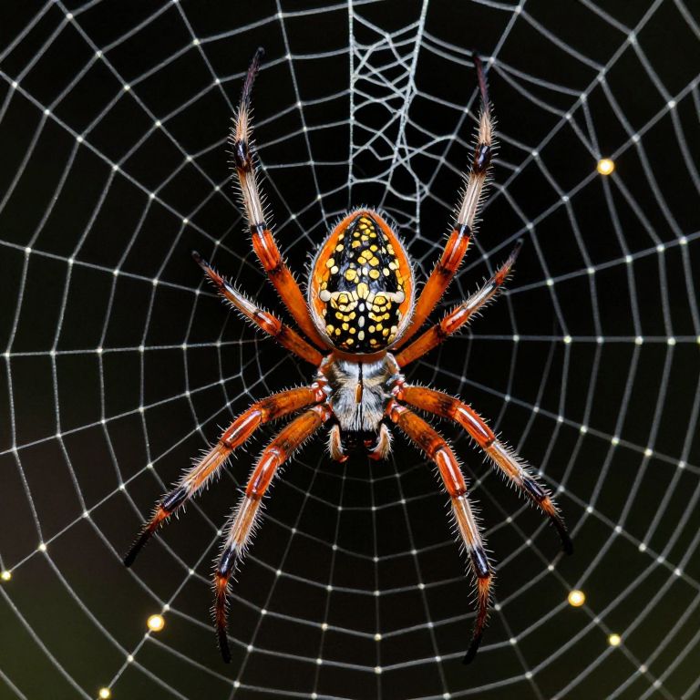 Vividly detailed spider perches atop a meticulously woven web, its intricate orange and black body adorned with golden patterns, while eight legs extend gracefully against a dark, grid-like background dotted with glowing orbs.
