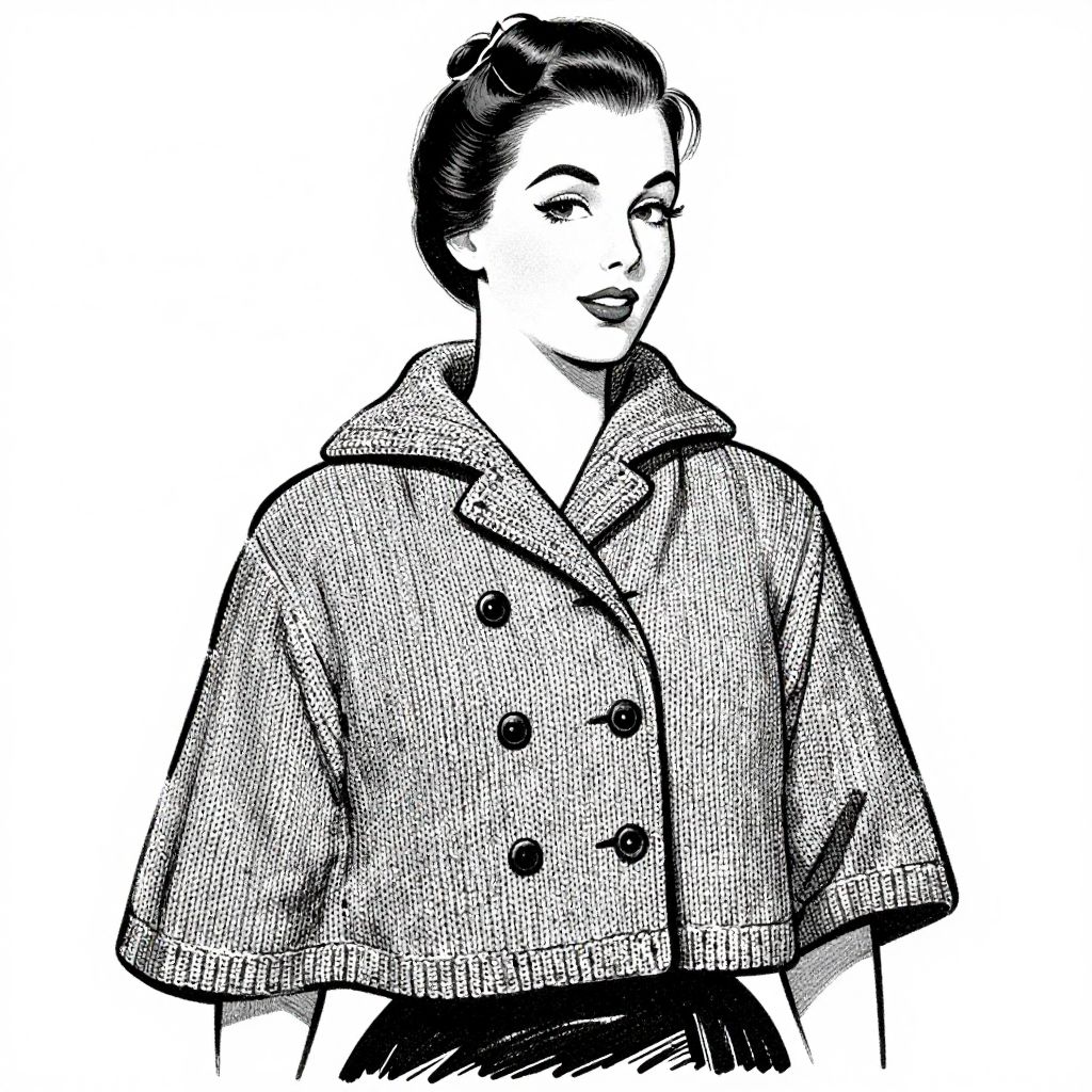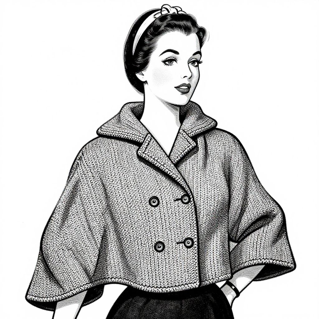 A vintage 1950s illustration showcases a woman wearing a stylish knitted cape with a double-breasted closure, rendered in a classic black-and-white comic book style, emphasizing retro fashion and timeless elegance.