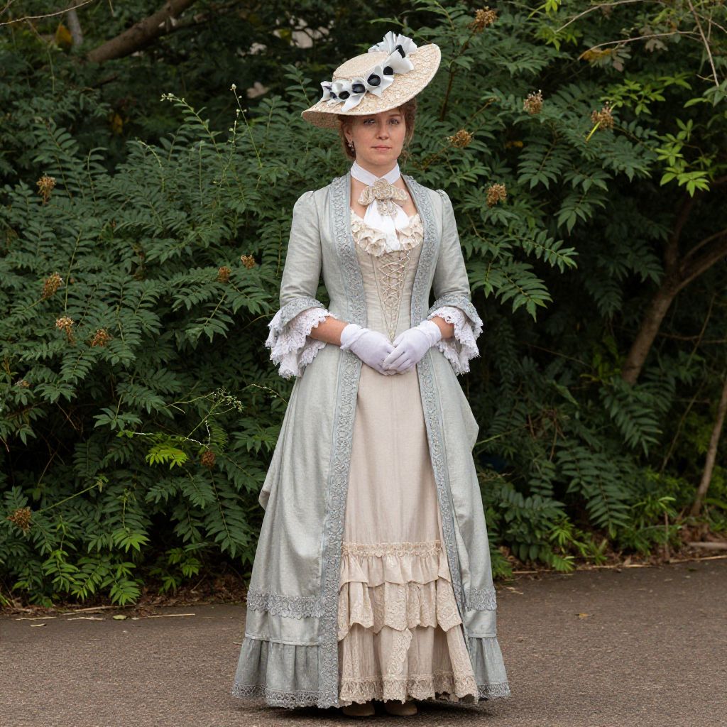 Photograph of a woman standing outdoors, wearing a Victorian-style, pale blue long-sleeved gown with intricate lace detailing, white ruffled underskirt, and white gloves. She has a high-neck white blouse adorned with a large lace collar and a white ribbon bow at the center. She wears a wide-brimmed hat decorated with white lace and black floral accents. Her brown hair is neatly styled under the hat. The background consists of dense, green foliage. The ground is paved, and the overall scene is brightly lit. The woman's expression is calm and poised.