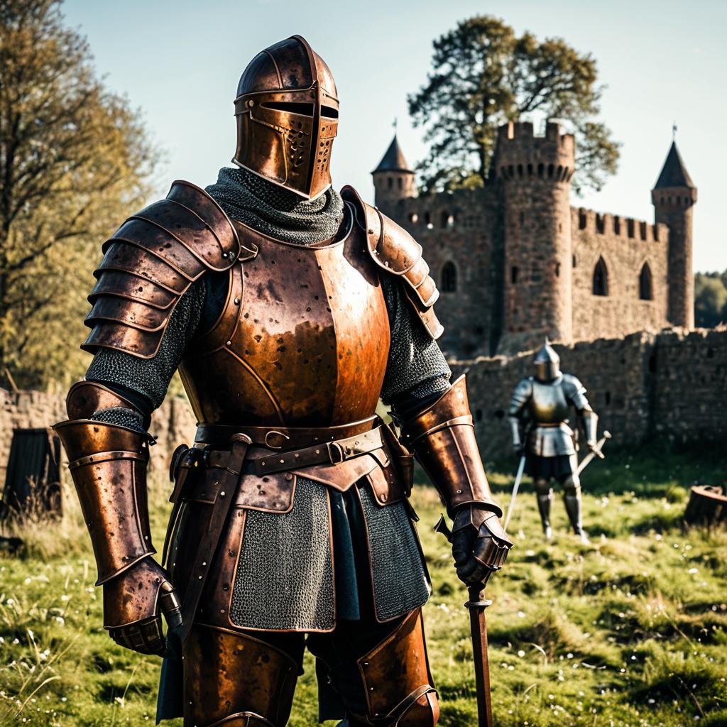 Knight made of rusted copper sticked together and has come to life. The rusted copper now looks like a real man and is 1.85 meters tall, very tall. The rusted copper man has an ultra-realistic face. The rusted copper man is standing next to a medieval battlefield and suspiciously eyes the medieval battlefield. The rusted copper glitters beautifully in the sunlight. Real-Life photo shot, full-Body photo, 8K UHD, many details, Award-winning.