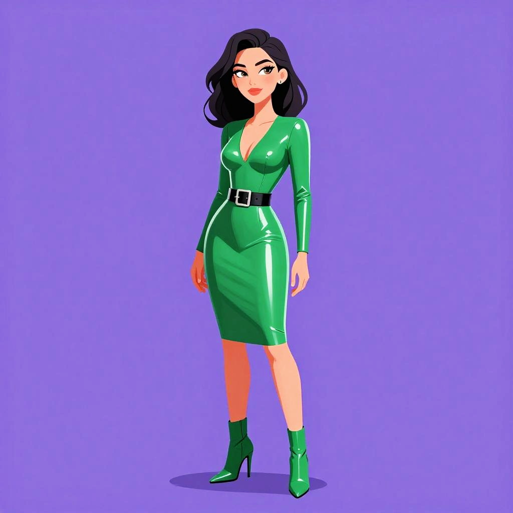 Woman with pretty face and pretty hair. Latex bodycon dress, emerald green, long sleeves, deep V-neck, figure-hugging silhouette, glossy sheen, Leather belt, wide, black, silver buckle, cinched waist, accentuating curves, Leather ankle boots, matching green, stiletto heel, sleek design, minimalist style --sref 1461