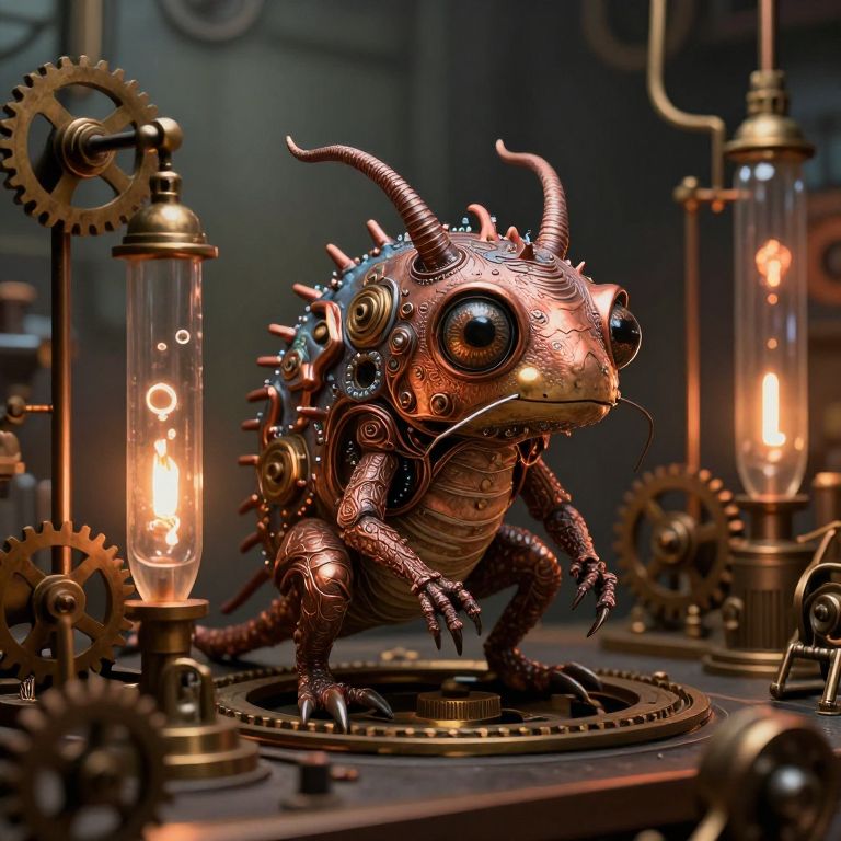 Mouselike creature in a steampunk laboratory, surrounded by vintage mechanical gears and glowing tubes, intricate metal textures, warm copper tones, imaginative and detailed environment merging organic and mechanical elements