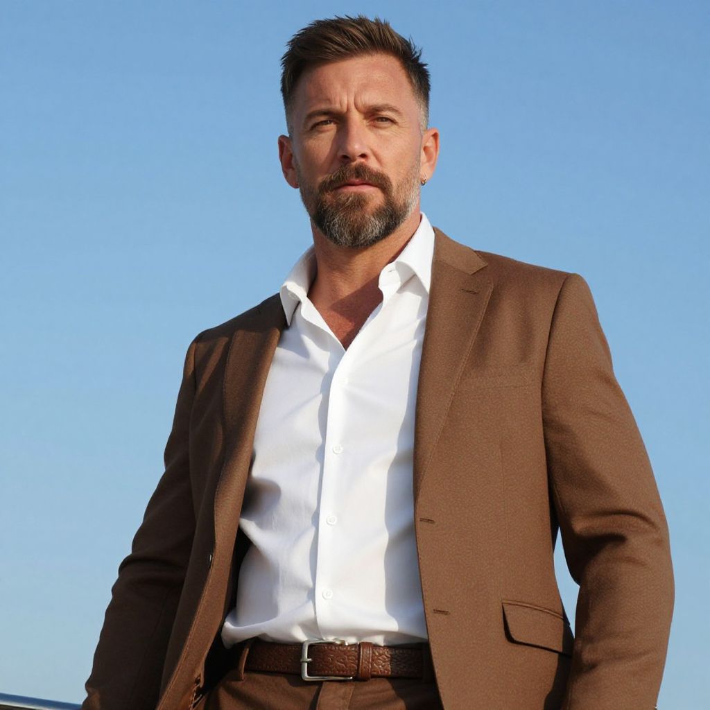 Yacht party outfit male, 1boy, male focus, solo, facial hair, shirt, jacket, white shirt, short hair, beard, belt, mustache, looking at viewer, brown jacket, sky, brown hair, open clothes, mature male, blue sky, collared shirt, realistic, upper body, day