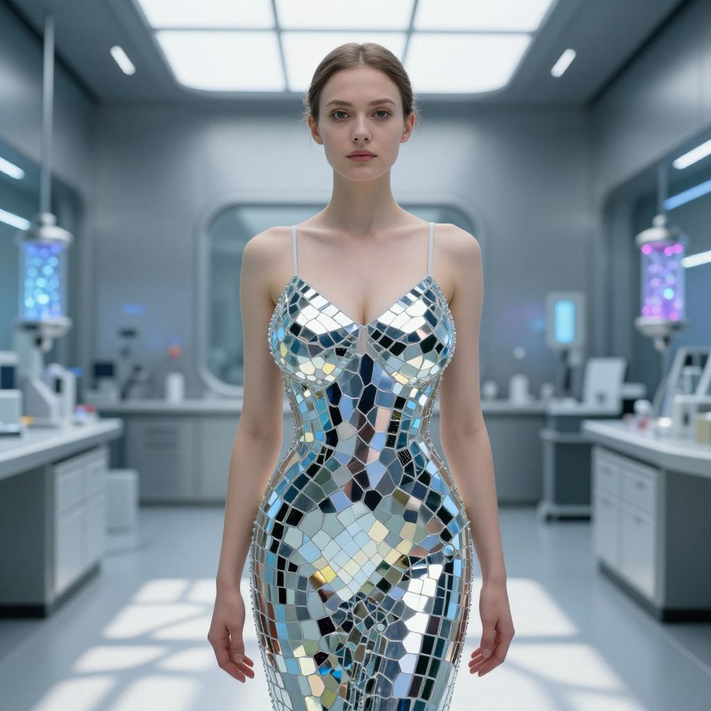 A mysterious woman with fair skin, high cheekbones, and a serene expression wears a striking Mirror Shard Dress composed of reflective mosaic tiles that shimmer and refract light into geometric patterns; set in a futuristic laboratory with cold steel walls and floating energy sources, the dress reflects fragmented light from overhead panels, casting intricate shadows on the floor.. The woman has big tits and cute face