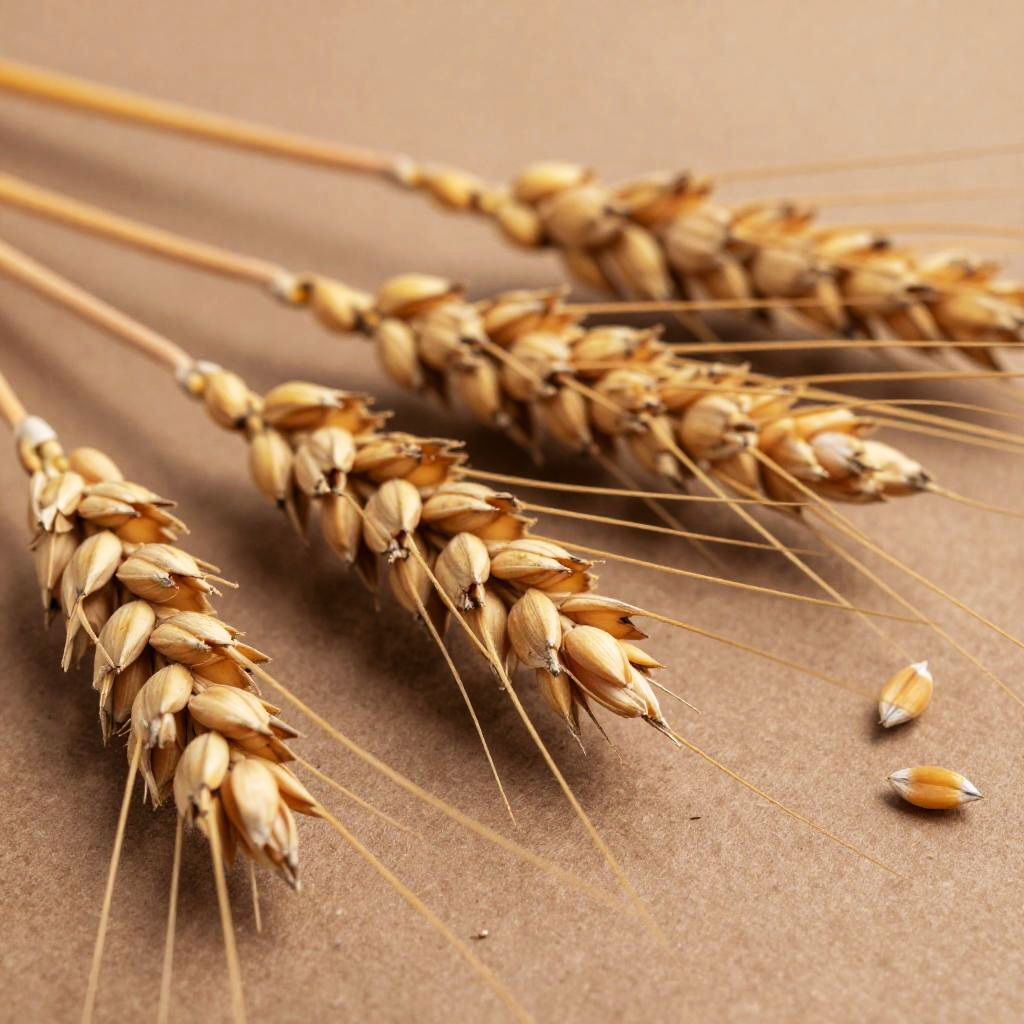 This is a close-up photograph of golden wheat stalks and grains scattered on a brown, textured surface. The wheat stalks are prominently in the foreground, with their plump, triangular grains and thin, wispy awns clearly visible. The background is slightly blurred, emphasizing the detailed texture and color of the wheat. The overall warm tones create a rustic, earthy feel.