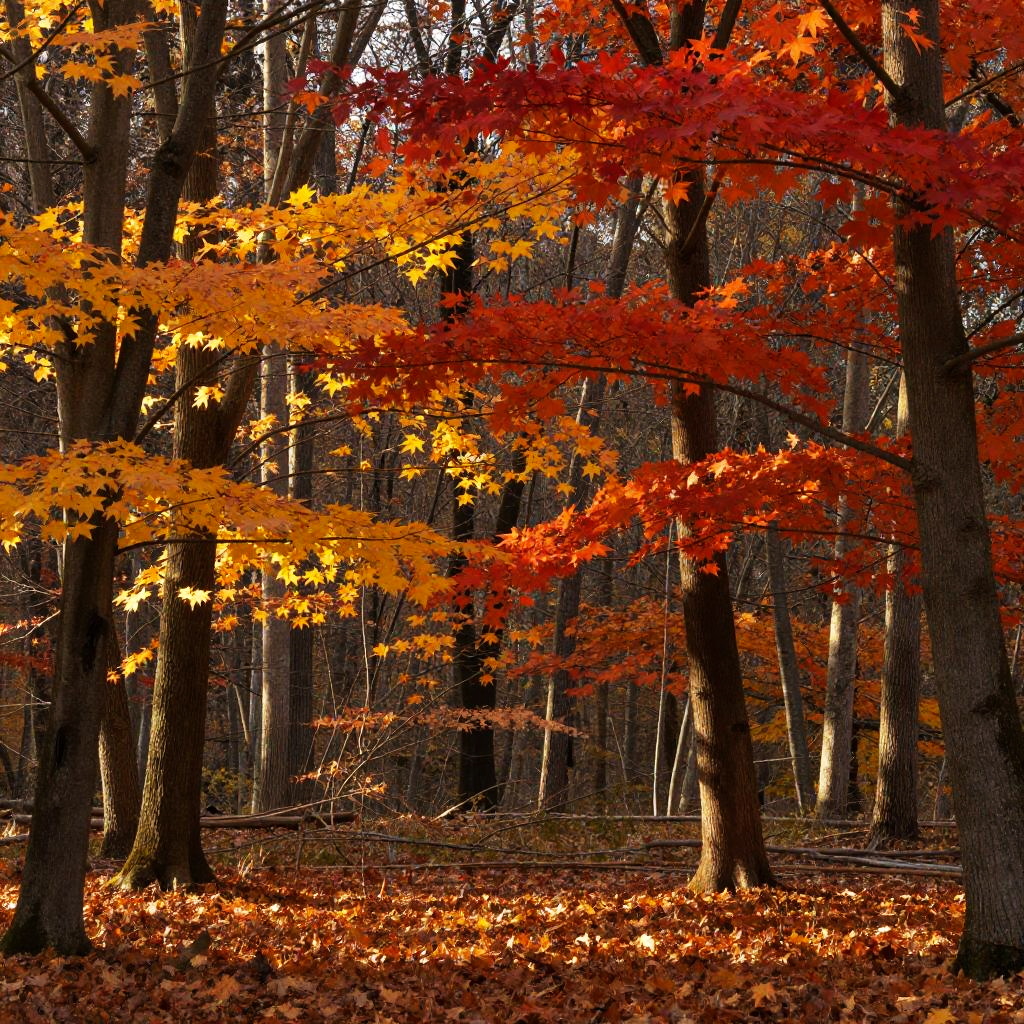 Real scenery of a dense autumn forest with trees in fiery red, orange, and yellow foliage, a carpet of fallen leaves on the ground, sunlight filtering through branches, creating a warm and inviting atmosphere full of seasonal charm.