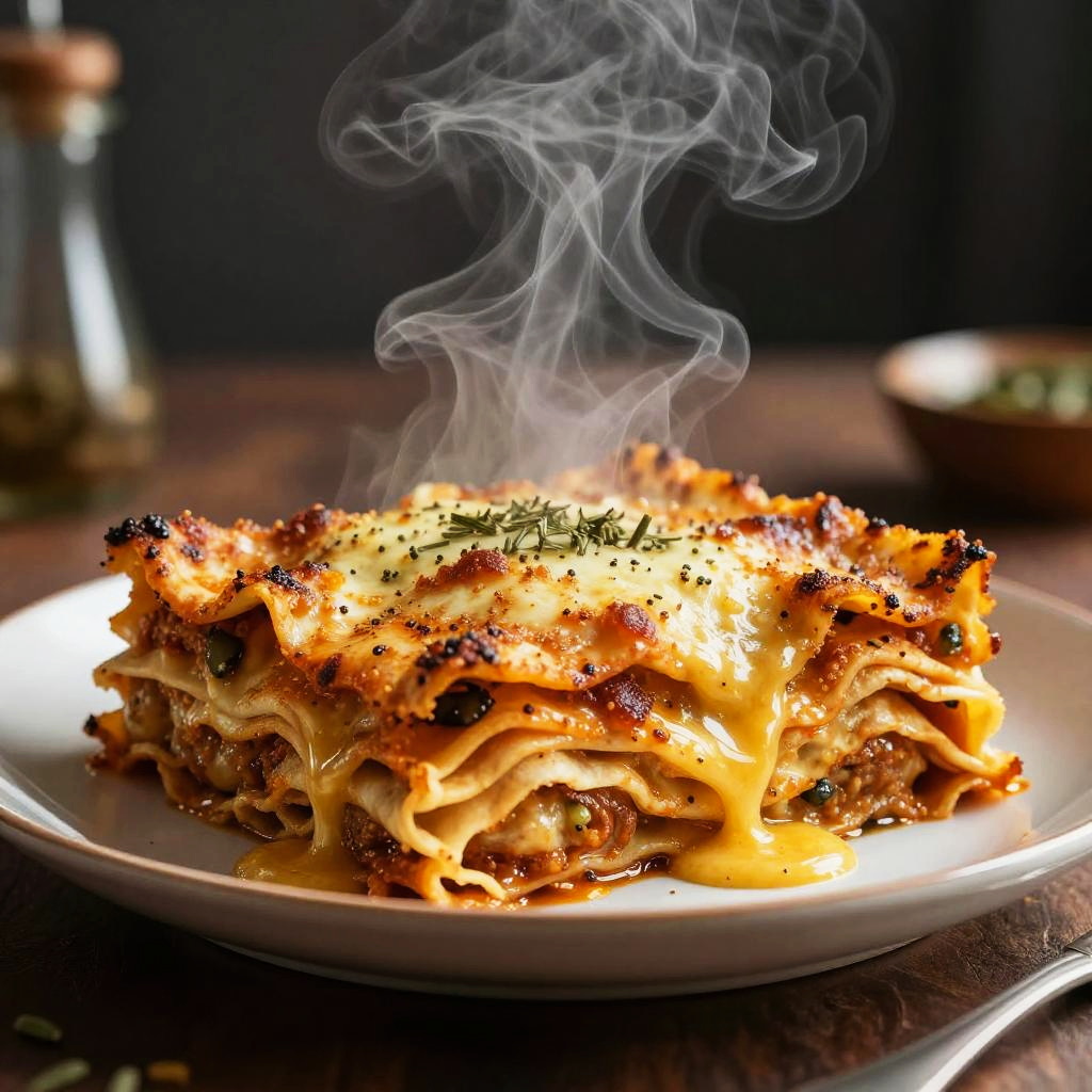 Close-up of a slice of steaming hot lasagna topped with melted cheese and herbs, served on a white plate. The lasagna features layers of pasta, meat sauce, and creamy cheese, with crispy edges and visible steam rising. The background has a dark, moody ambiance with soft dramatic lighting emphasizing the texture and richness of the dish.