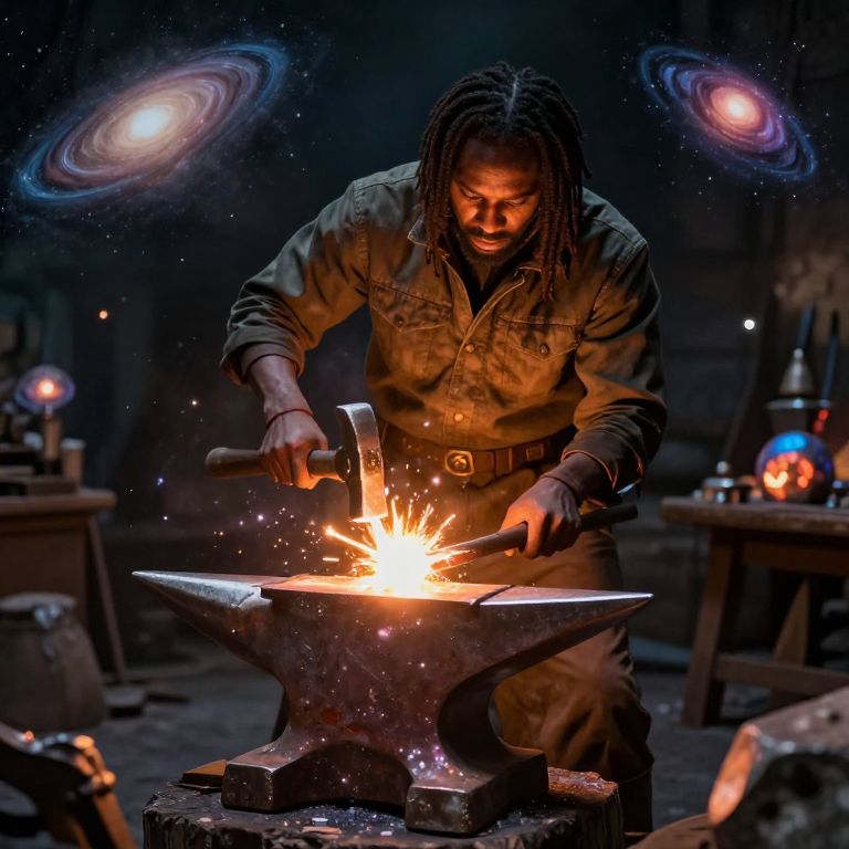 A levitating blacksmith forges stars in his anvil, hammering radiant novas into glowing celestial ingots while surrounded by floating galaxies.