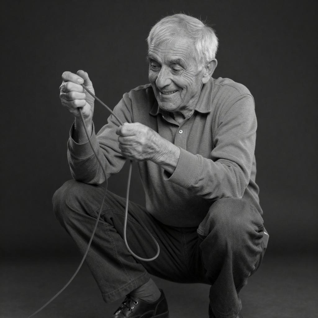 Black-and-white photo of an elderly man with short, light hair, crouching and smiling while holding a tangled wire. The man wears a long-sleeved shirt and pants, set against a dark background. His expression is joyful and engaged.
