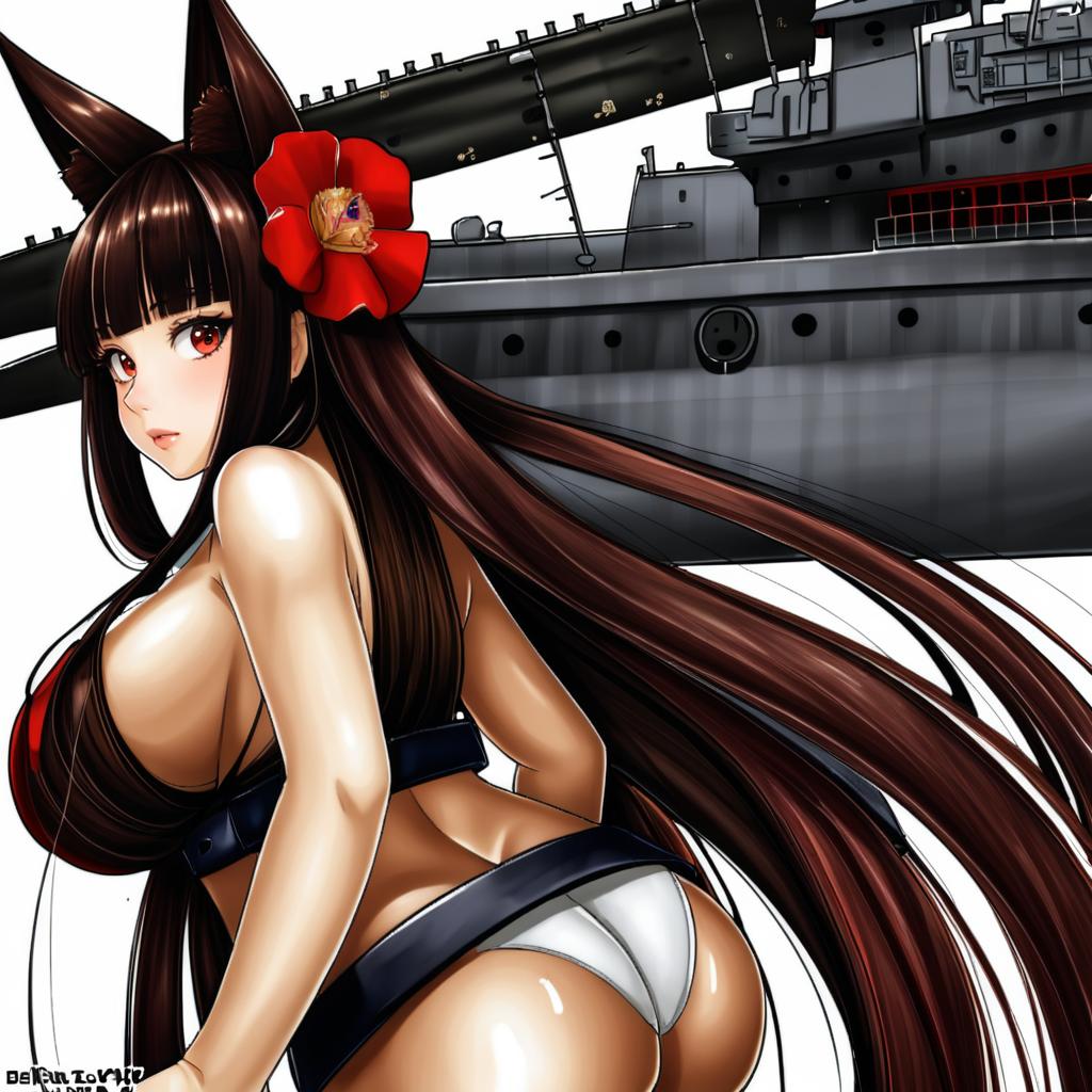 Digital anime illustration of a fox-eared girl with long brown hair and red eyes, wearing a revealing outfit with a red flower in her hair. She is posed in front of a large gray warship. The character has large breasts and a curvy figure, with bare shoulders and expressive eyes.