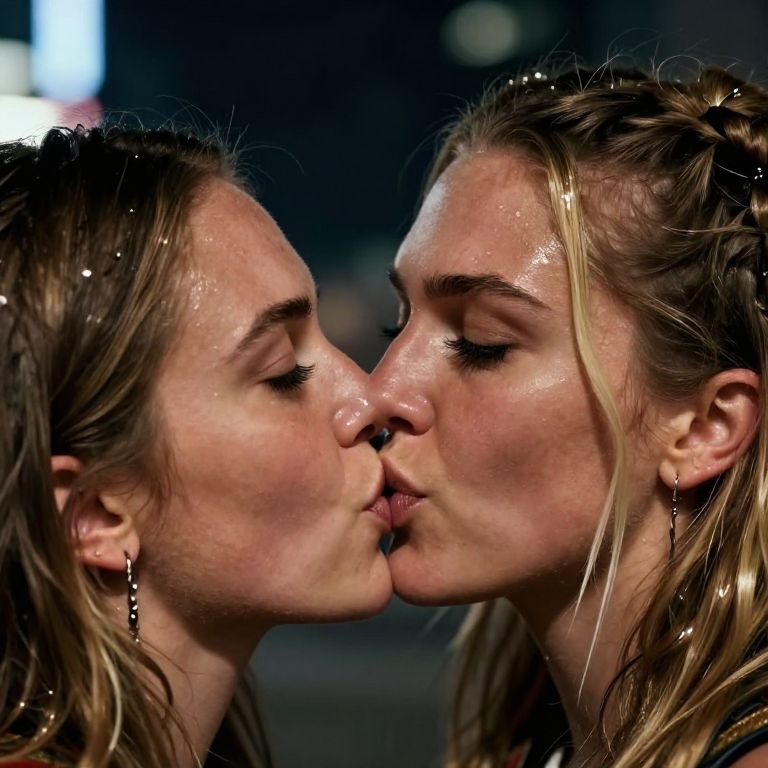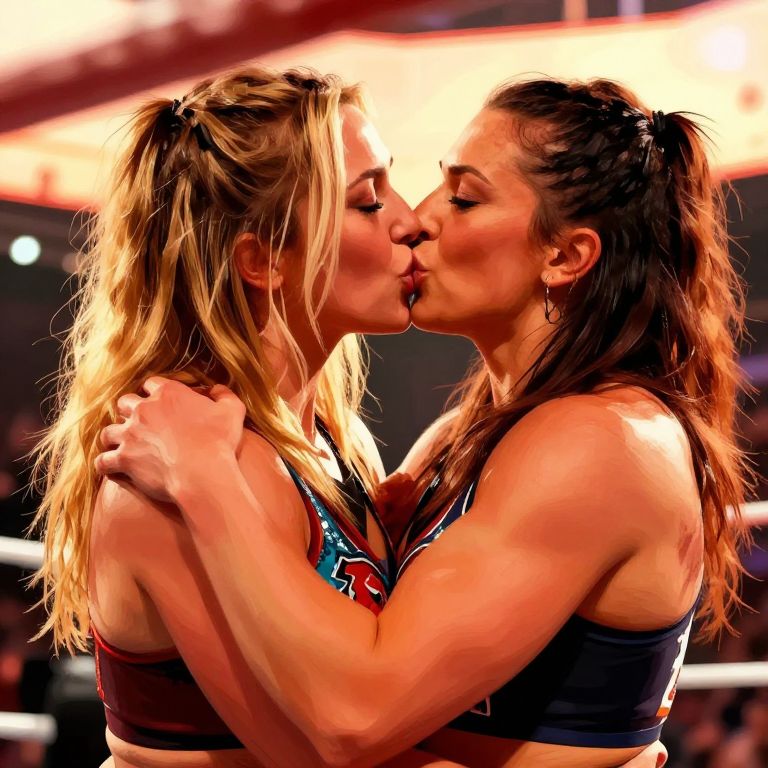 Becky Lynch kiss illustrated with bold brush strokes, cinematic close-up, warm sunset lighting, high contrast, capturing passion and tenderness in a wrestling ring environment