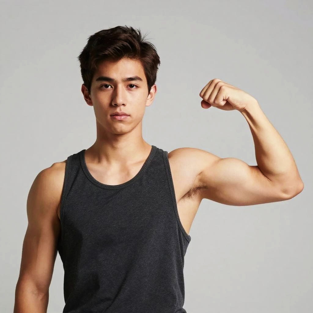 Photograph of a young man with short, dark brown hair, flexing his right bicep. He has a light skin tone and a muscular build, wearing a dark gray, sleeveless tank top. His expression is neutral, and the background is a plain, light gray. The lighting highlights his defined arm muscles, giving the image a focused, studio-like feel.