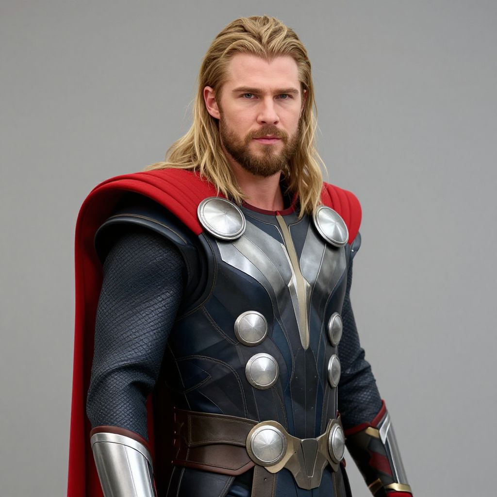 "replica thor costume, male focus, 1boy, blonde hair, cape, armor, long hair, realistic, facial hair, beard, red cape, standing, solo Realistic photo of casual sexy person with pretty face"