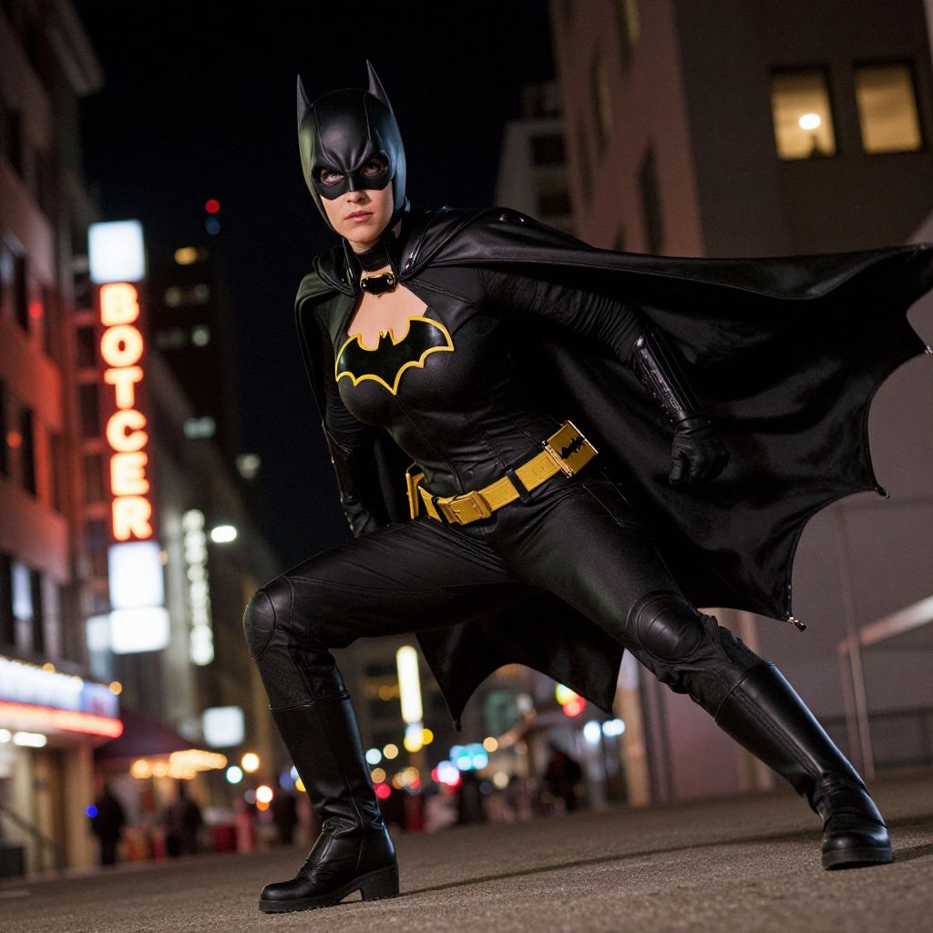 Photograph of a female Batman cosplayer standing in a nighttime urban street. She wears a black latex suit with a prominent yellow Bat-symbol on the chest, black bat ears on her head, and a flowing black cape. Her outfit includes black gloves, a yellow utility belt, and black boots. She is in a dynamic, crouching stance with legs apart and hands on her knees. The background features blurred, brightly lit neon signs and buildings, adding a cityscape vibe. The overall lighting highlights her costume, casting shadows that enhance the dramatic effect.
