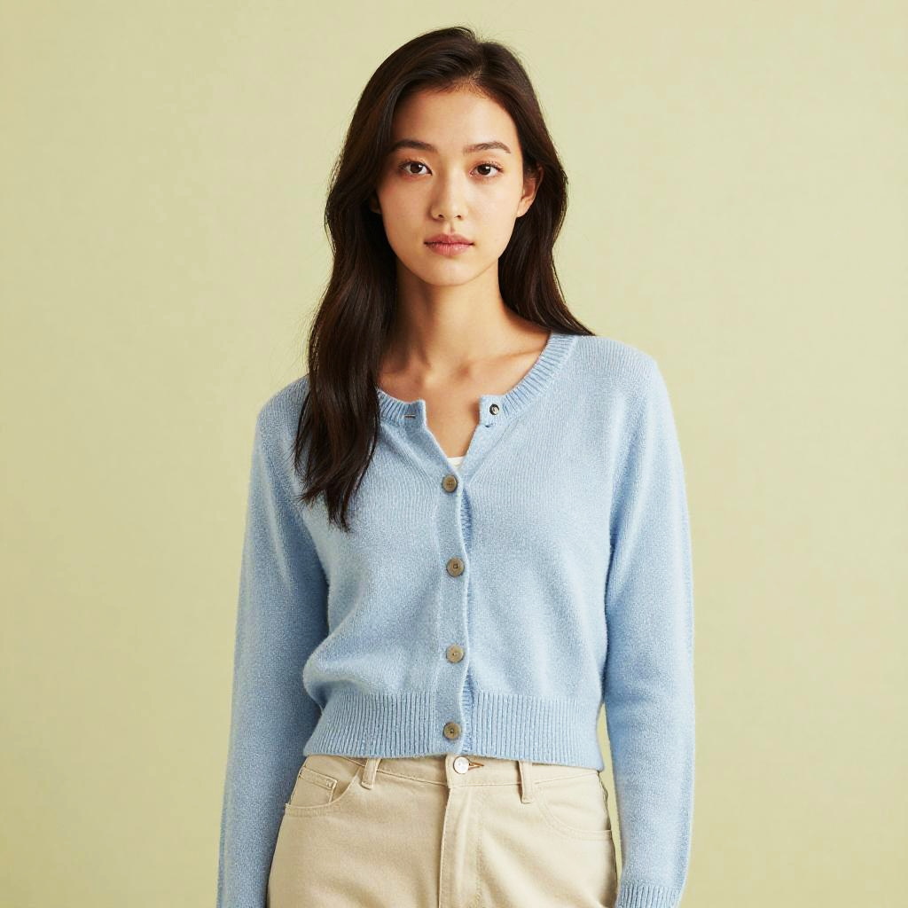 Photograph of an Asian woman with long, straight black hair and light brown skin. She is wearing a light blue, knitted cardigan with a v-neck and three brown buttons, paired with beige high-waisted pants. She has a neutral expression and is standing against a plain, light yellow background. The cardigan's texture is soft and slightly ribbed, contrasting with the smooth fabric of her pants. The lighting is even, highlighting her facial features and clothing details.