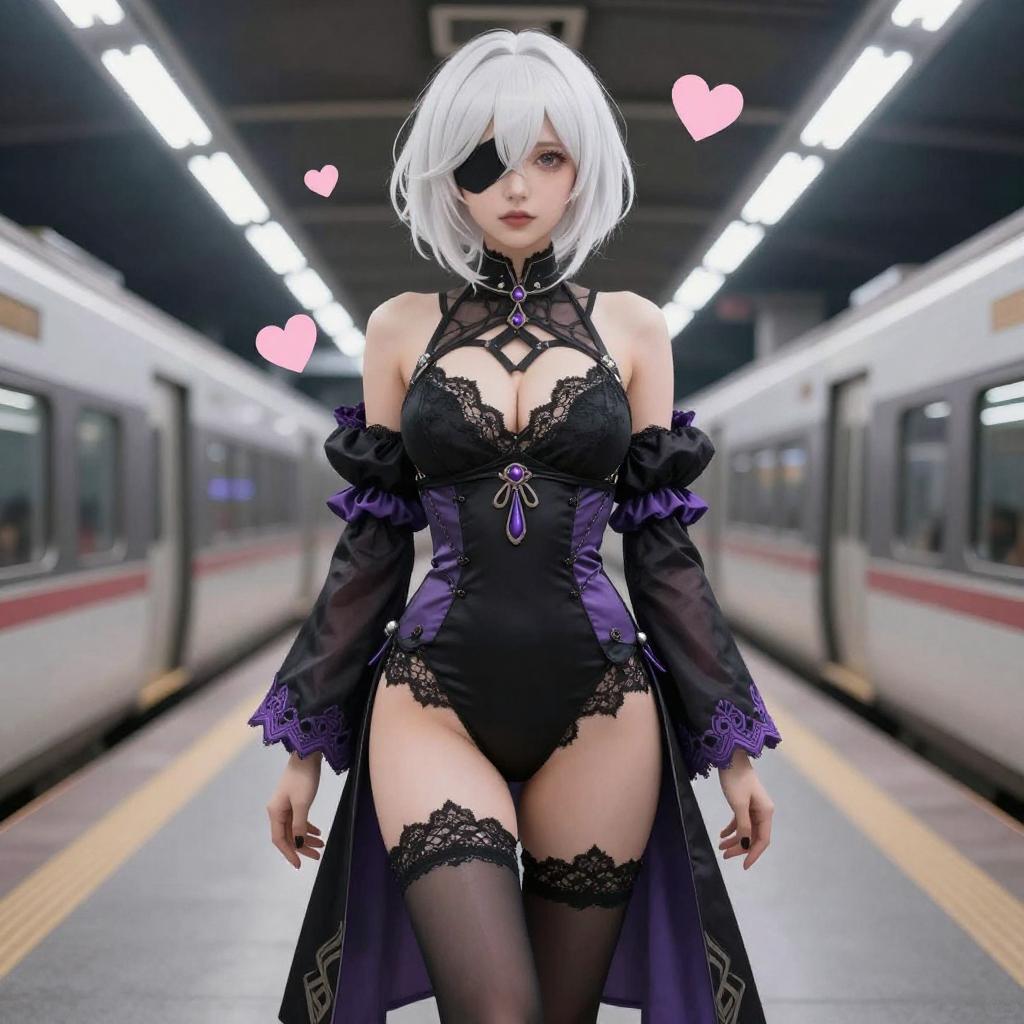 Anime Style Female Character in Black Lace Bodysuit at Train Station