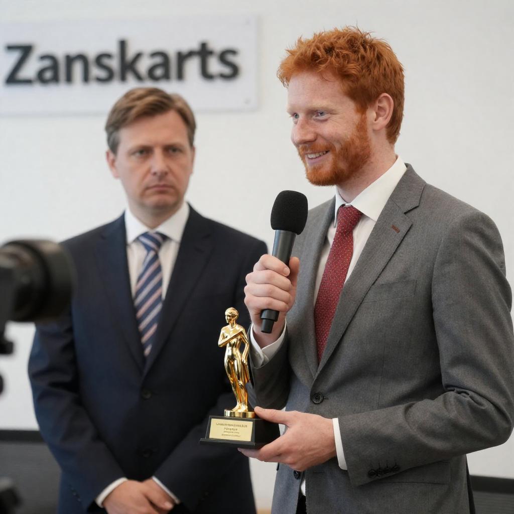 Photograph of two men in an office. Red-haired man in gray suit, white shirt, red patterned tie, holding microphone and awards, smiling. Brown-haired man in dark suit, white shirt, striped tie, looking serious. Camera on left. Sign "Zanskarts" on wall.