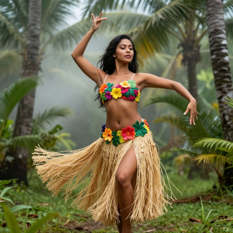 A stunning tropical island dancer with sun-kissed skin, full lips, and a serene expression stands in a misty palm grove, wearing a flowing grass skirt adorned with hand-embroidered tropical flowers, her body subtly motioned in a graceful pose, the soft breeze rustling the foliage and highlighting her bare toned legs and toned waist.